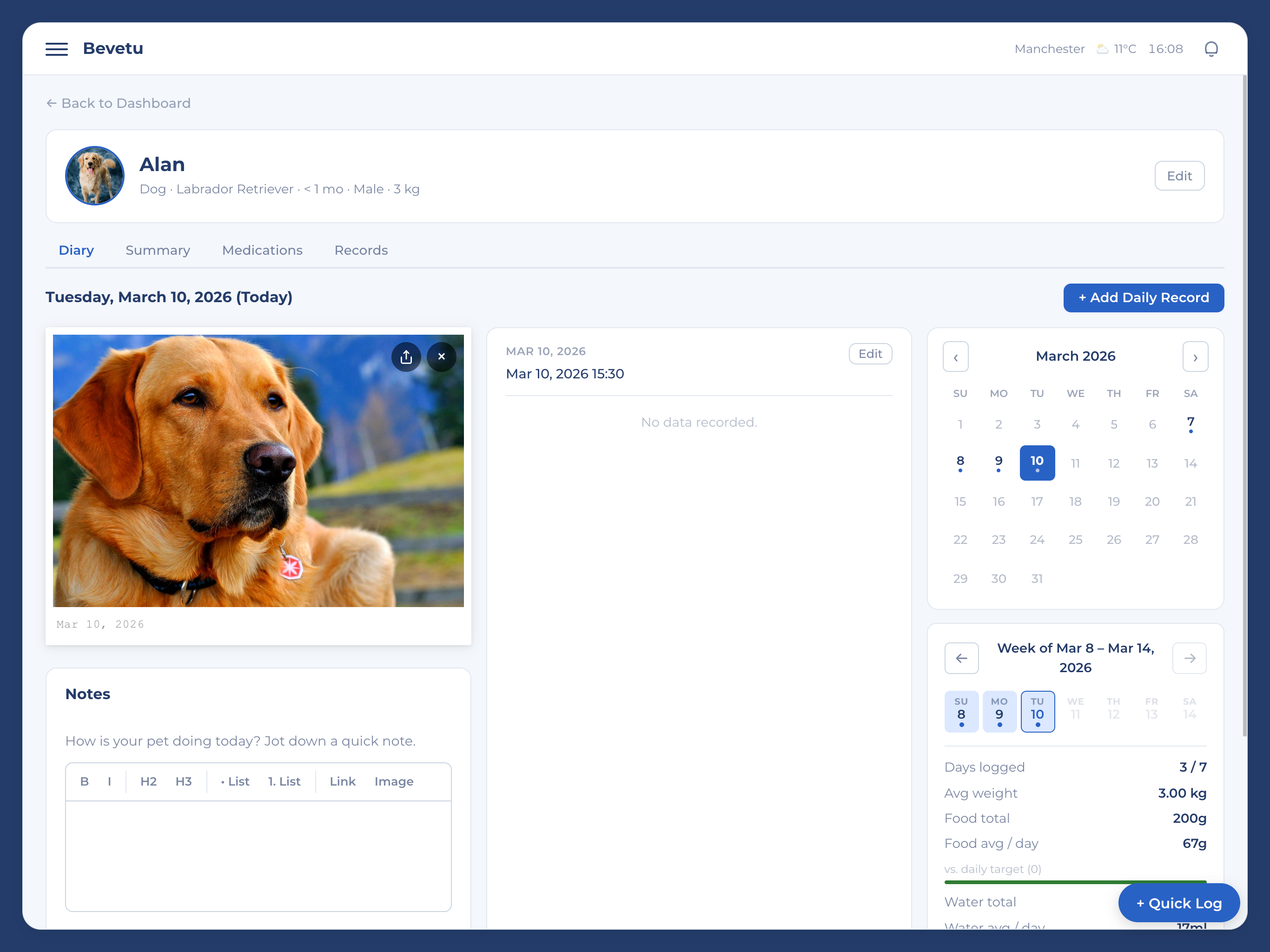 Comprehensive daily logging for every aspect of your pet's health. From food and water intake to walks, toilet habits, weight, vitals, sleep quality, and gastrointestinal health.